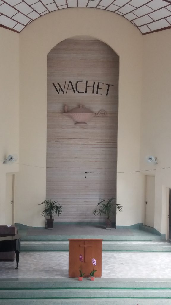 Inspirada na parábola das dez virgens (Mt 25.1-13), a lâmpada acesa na parede atrás do púlpito é o símbolo mais identificável da igreja. Ela exorta: “Wachet” (vigiai)! Crer na vinda de Jesus e preparar-se para ela é tarefa de todo cristão.
