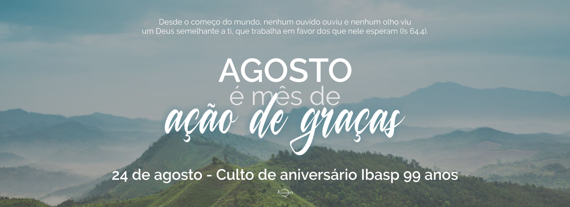 Culto de aniversário No dia 24 de agosto vamos celebrar juntos os 99 anos do cuidado e fidelidade de Deus para com a nossa Ibasp.…